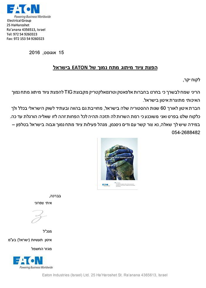 Mr. Itai Zefroni, the Israeli branch CEO of Eaton, issued a letter for all the company’s customers reporting that the sister companies AlfaTek & TransElectric were chosen as primary distributors and emphasized that: